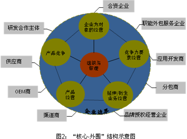 基于産品競争經(jīng)營者,一般是將(jiāng)核心功能(néng)或功能(néng)中的核心、關鍵部分内化;而將(jiāng)生産性、操作性和向(xiàng)更廣泛領域的應用性開(kāi)發(fā)等非核心功能(néng)或功能(néng)中的非核心部分外化,交由外圍主體去做,核心企業和外圍夥伴共同構成(chéng)價值的完整經(jīng)營過(guò)程和經(jīng)營體系,見下圖2。外圍企業是核心企業的功能(néng)補充,有時(shí)還(hái)是一種(zhǒng)重要的功能(néng)補充,如通過(guò)合資公司和代理商進(jìn)入受一個國(guó)家政策限制的市場。核心企業和外圍企業結成(chéng)一種(zhǒng)共生關系,核心企業爲外圍企業創造業務機會(huì),外圍企業補充核心企業個體的能(néng)量的有限性。