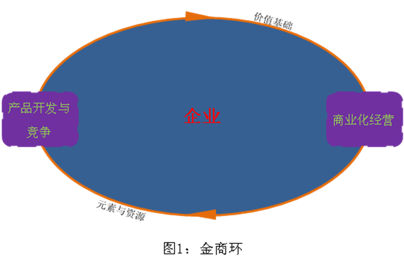 企業是人類實踐的一類功能(néng)性和機制性主體。企業是與産品、商業化、競争等密切相關的一類主體。企業是“産品開(kāi)發(fā)與競争-商業化經(jīng)營”循環系統的載體和效率機器。我將(jiāng)“産品開(kāi)發(fā)與競争-商業化經(jīng)營”循環命名爲“金商環”:産品開(kāi)發(fā)與競争形成(chéng)商業化經(jīng)營的價值基礎;商業化經(jīng)營向(xiàng)産品開(kāi)發(fā)與競争輸送元素與資源;二者循環再循環,見下圖1。“基業常青”就(jiù)是指該循環能(néng)生生不息。