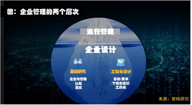 企業管理有兩(liǎng)個層次的内容構成(chéng):企業設計和運行管理,就(jiù)如一座冰山的水下部分和水上部分(見下圖1)。成(chéng)熟企業,水下部分較大;初創企業,水上部分較大。其中,企業設計包括對(duì)運行管理體系的設計。在現實中,很多人意識中的管理,其實就(jiù)隻是指運行管理,不包括企業設計,這(zhè)是對(duì)管理認知上的殘缺。