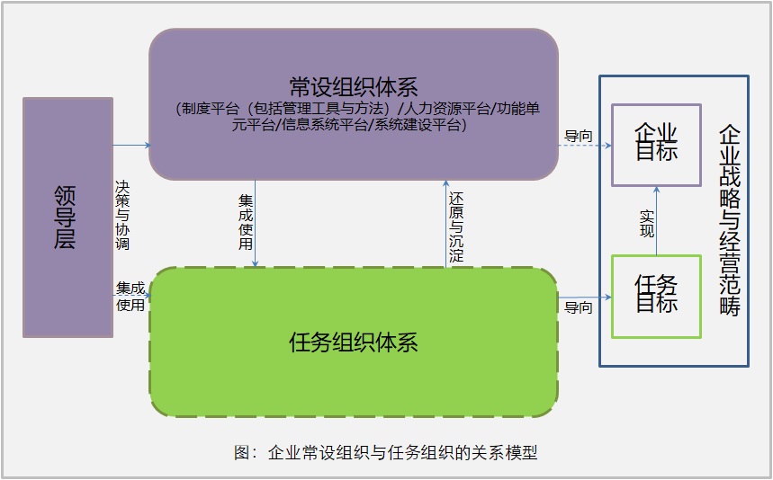 任務組織體系的設計導向(xiàng)是任務目标;組織平台與組織容器的建設導向(xiàng)是企業目标。任務目标因任務不同而不同;企業目标則具有相對(duì)的穩定性。企業目标和任務由戰略與經(jīng)營模式決定,所以說(shuō),企業組織是對(duì)企業戰略和經(jīng)營模式的實現。圖中,任務組織體系用虛線框表達,有兩(liǎng)個含義:其一,相對(duì)于常設組織體系而言,具有臨時(shí)性,其存續時(shí)間僅等于任務周期(重複的任務,可以理解爲是同一個任務),而不是企業生命周期;其二,任務組織包括可能(néng)的對(duì)外部資源和功能(néng)單元的集成(chéng)使用,即是一種(zhǒng)所謂的開(kāi)放式組織——開(kāi)放式組織是通過(guò)任務組織實現的,常設組織體系不存在組織開(kāi)放問題(隻有功能(néng)開(kāi)放,屬企業經(jīng)營範疇)——這(zhè)也确保了企業組織架構和系統的基本的穩定性和确定性,以及企業組織的穩定性和開(kāi)放性、适應性的統一。